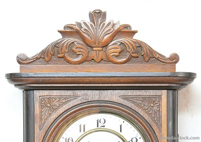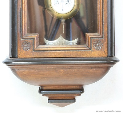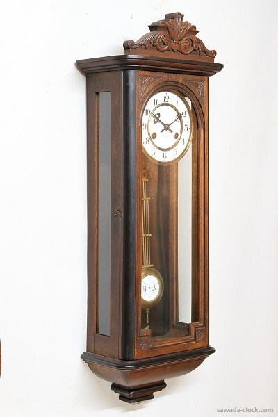 三面ガラス張りのケースは各所に細かな彫刻が施され、黒と茶の2トーンに塗り分けられている。冠部には力強い彫り物が付けられ、角を丸められたデザインにアクセントとなっている。機械は香箱入りゼンマイの高級機械が入り、琺瑯文字盤は割れ、欠けなく綺麗。