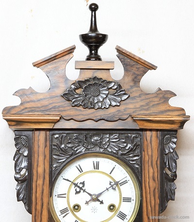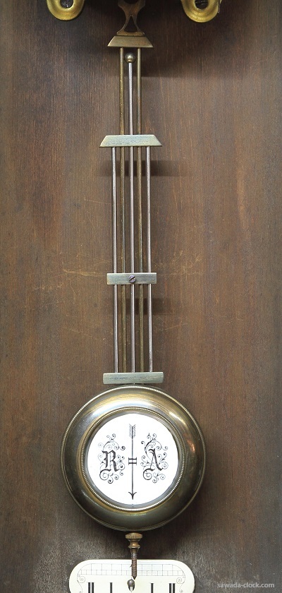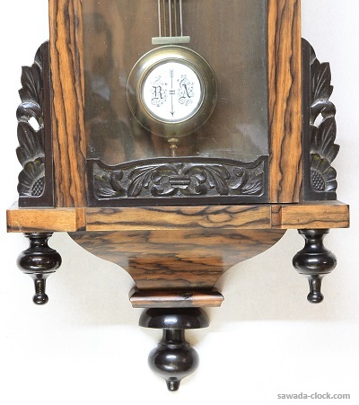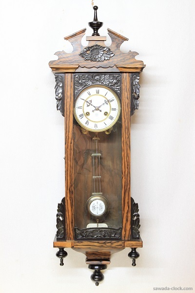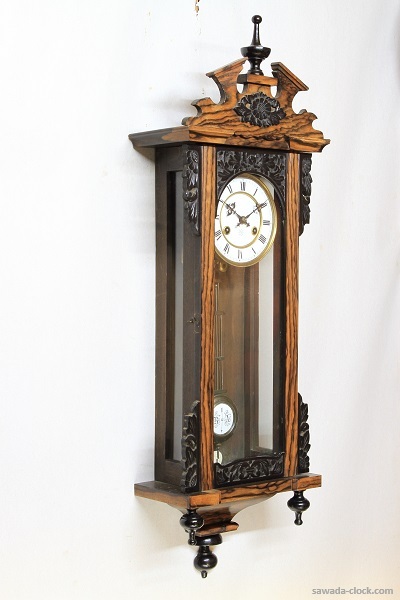 貴重な黒柿材で造られたケースにユンハンスの香箱入りゼンマイ式の高級機械が入った三面ガラス張りのスリゲル時計。黒柿独特の木肌が味わい深い。文字盤、振り子玉中央は琺瑯で割れ、欠けなく綺麗。